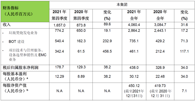 浙能錦江環(huán)境公布2021年全年業(yè)績(jī),2021年全年收入同比增加31.6%至人民幣40.6億元,垃圾焚燒發(fā)電收入同比增長(zhǎng)17.2%,稅后歸屬股東凈利潤(rùn)同比增長(zhǎng)34.0%至人民幣4.4億元。 a)2021年第四季度和全年以及2020年第四季度和全年,每股盈利是根據(jù)加權(quán)平均股數(shù)來(lái)計(jì)算的。b)2021年12...