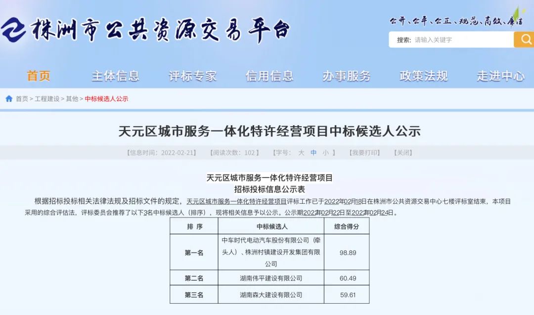 2月21日,株洲市公共資源交易平臺發(fā)布天元區(qū)城市服務(wù)一體化特許經(jīng)營項目的中標候選人公示。中車時代電動汽車股份有限公司(牽頭人)、株洲村鎮(zhèn)建設(shè)開發(fā)集團有限公司以98.89分的綜合得分奪得第一名。 來源 |環(huán)衛(wèi)科技網(wǎng)作者 | 王應(yīng)心 又一央企闖入城服市場! 2月21日,株洲市公共資源交易平臺發(fā)布天元區(qū)城...