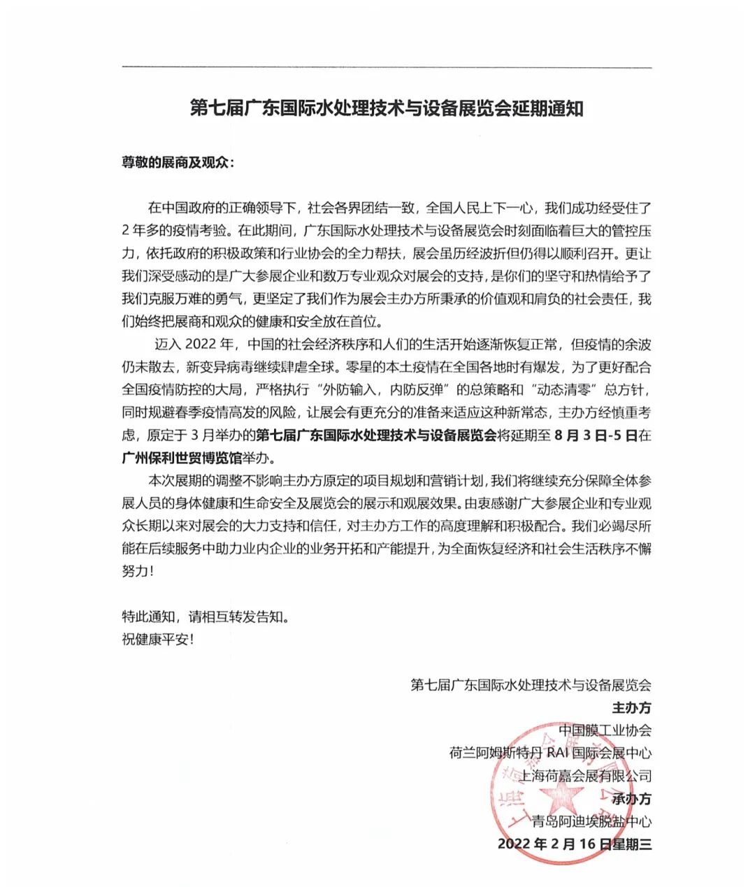 原定于2022年3月31-4月2日在廣州保利世貿(mào)博覽館舉辦的第七屆廣東水展將延期至2022年8月3日-5日。場館地址不變,特作出以下公告,對于延期給您帶來的不便深表歉意。 第七屆廣東國際水處理技術(shù)與設(shè)備展覽會延期通知 尊敬的展商及觀眾: 在中國政府的正確領(lǐng)導(dǎo)下,社會各界團結(jié)一致,全國人民上下一心,我...