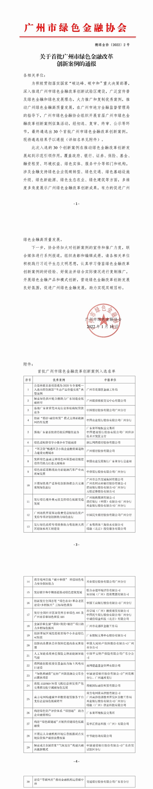 近日,廣州市綠色金融協(xié)會正式公布首批廣州市綠色金融改革創(chuàng)新案例征集活動遴選結果,最終遴選出30個首批廣州市綠色金融改革創(chuàng)新案例。 此次入選的30個創(chuàng)新案例在推動綠色金融改革創(chuàng)新發(fā)展起到示范引領作用,覆蓋政府、銀行、證券、保險、基金、融資租賃、環(huán)境權益、綠色實體、服務中介等部門和機構,涉及金融支持綠色...