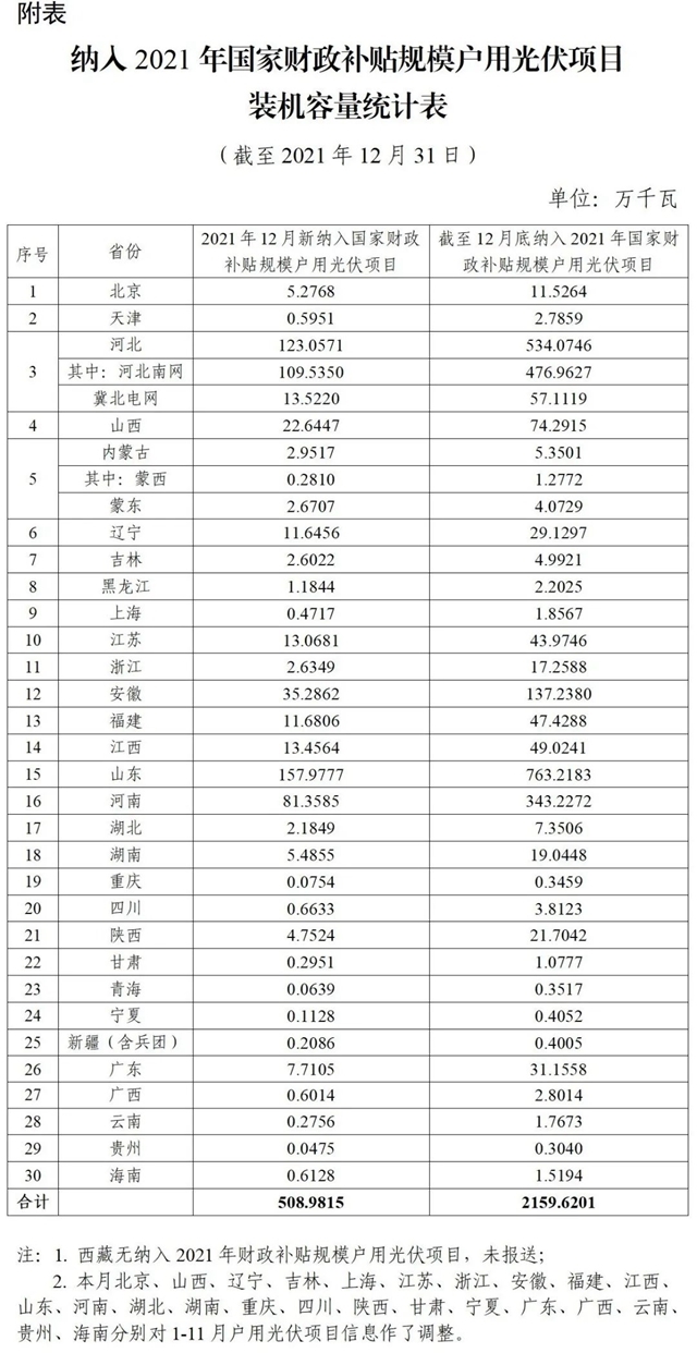 按照《國家能源局關于2021年風電、光伏發(fā)電開發(fā)建設有關事項的通知》(國能發(fā)新能〔2021〕25號)和《國家能源局綜合司關于2019年戶用光伏項目信息公布和報送有關事項的通知》(國能綜通新能〔2019〕45號)關于戶用光伏項目管理有關要求,全國共有30個省份報送了戶用光伏項目信息(西藏無納入2021...