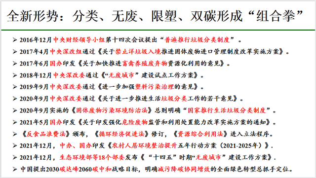 日前,環(huán)境商會組織召開環(huán)衛(wèi)產(chǎn)業(yè)研討會,特邀清華大學(xué)劉建國教授出席。會上,劉建國詳細分析了當前固廢行業(yè)形勢。 劉建國表示,目前固廢行業(yè)整體面臨全新形勢。一是分類、無廢、限塑、雙碳將形成“組合拳”。 劉建國指出,從2000年提出垃圾分類到現(xiàn)在,垃圾分類和20多年前有很大不同:過去...