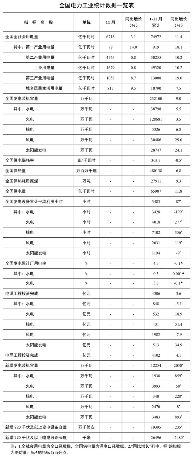 2021年12月17日,國(guó)家能源局發(fā)布1-11月份全國(guó)電力工業(yè)統(tǒng)計(jì)數(shù)據(jù)。截至11月底,全國(guó)發(fā)電裝機(jī)容量約23.2億千瓦,同比增長(zhǎng)9.0%。其中,風(fēng)電裝機(jī)容量約3.0億千瓦,同比增長(zhǎng)29%;太陽(yáng)能發(fā)電裝機(jī)容量約2.9億千瓦,同比增長(zhǎng)24.1%。 1-11月份,全國(guó)發(fā)電設(shè)備累計(jì)平均利用3483小時(shí),比上...