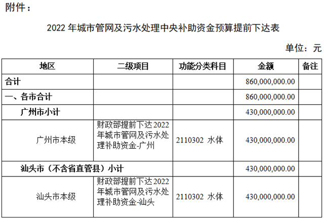 廣東省財政廳關于提前下達2022年中央城市管網(wǎng)及污水處理補助資金的通知粵財建〔2021〕54號廣州市、汕頭市財政局: 根據(jù)《財政部關于提前下達2022年城市管網(wǎng)及污水處理補助資金預算的通知》(財建〔2021〕338號),現(xiàn)將2022年中央城市管網(wǎng)及污水處理補助資金預算資金提前轉(zhuǎn)下達給你們(具體金額詳...