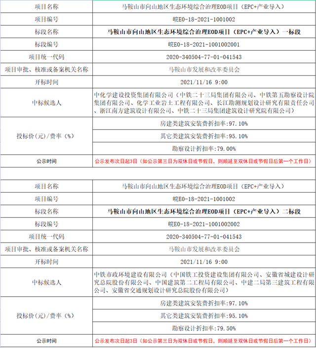 2021年11月17日,馬鞍山市公告資源交易中心發(fā)布《馬鞍山市向山地區(qū)生態(tài)環(huán)境綜合治理EOD項目(EPC+產(chǎn)業(yè)導入)項目中標公示》。 根據(jù)招標工作,該項目包含34個子項目,總標的額477950萬元,分為兩個標段招標。 一標段(生態(tài)修復類),共包含21個子項目: 1.寨山整治項目; 2.羅卜山、霍里鐵...