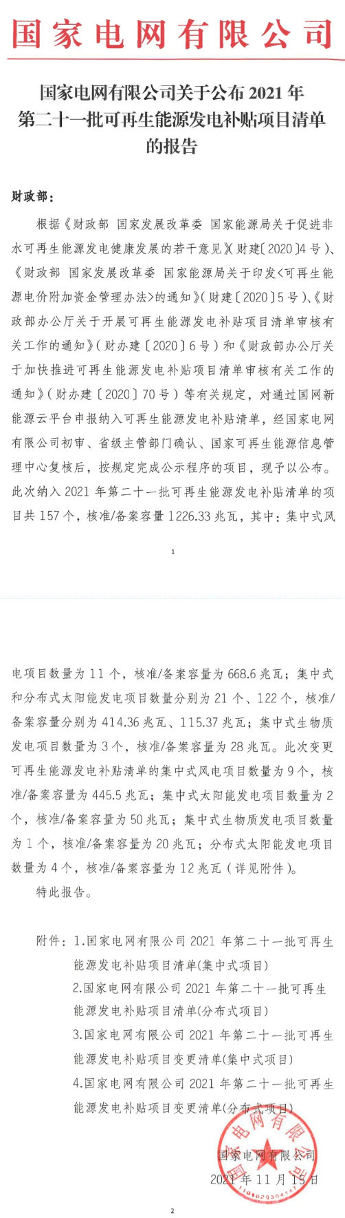 關(guān)于公布2021年第二十一批可再生能源發(fā)電補(bǔ)貼項(xiàng)目清單的公告 根據(jù)《財(cái)政部 國(guó)家發(fā)展改革委 國(guó)家能源局關(guān)于促進(jìn)非水可再生能源發(fā)電健康發(fā)展的若干意見(jiàn)》(財(cái)建〔2020〕4號(hào))、《財(cái)政部 國(guó)家發(fā)展改革委 國(guó)家能源局關(guān)于印發(fā)<可再生能源電價(jià)附加資金管理辦法>的通知》(財(cái)建〔2020〕5號(hào))、《...