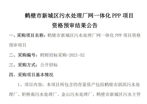 近日,中國(guó)水網(wǎng)從E20標(biāo)訊系統(tǒng)E標(biāo)通獲悉,鶴壁市新城區(qū)污水處理廠網(wǎng)一體化PPP項(xiàng)目正式發(fā)布資格預(yù)審結(jié)果公告。中節(jié)能國(guó)禎環(huán)??萍脊煞萦邢薰?、城發(fā)環(huán)境股份有限公司(聯(lián)合體牽頭人)與城發(fā)水務(wù)有限公司(聯(lián)合體成員)、深圳市環(huán)水投資集團(tuán)有限公司,通過初步資格預(yù)審。項(xiàng)目總投資61,239.26萬元,計(jì)劃合作期...