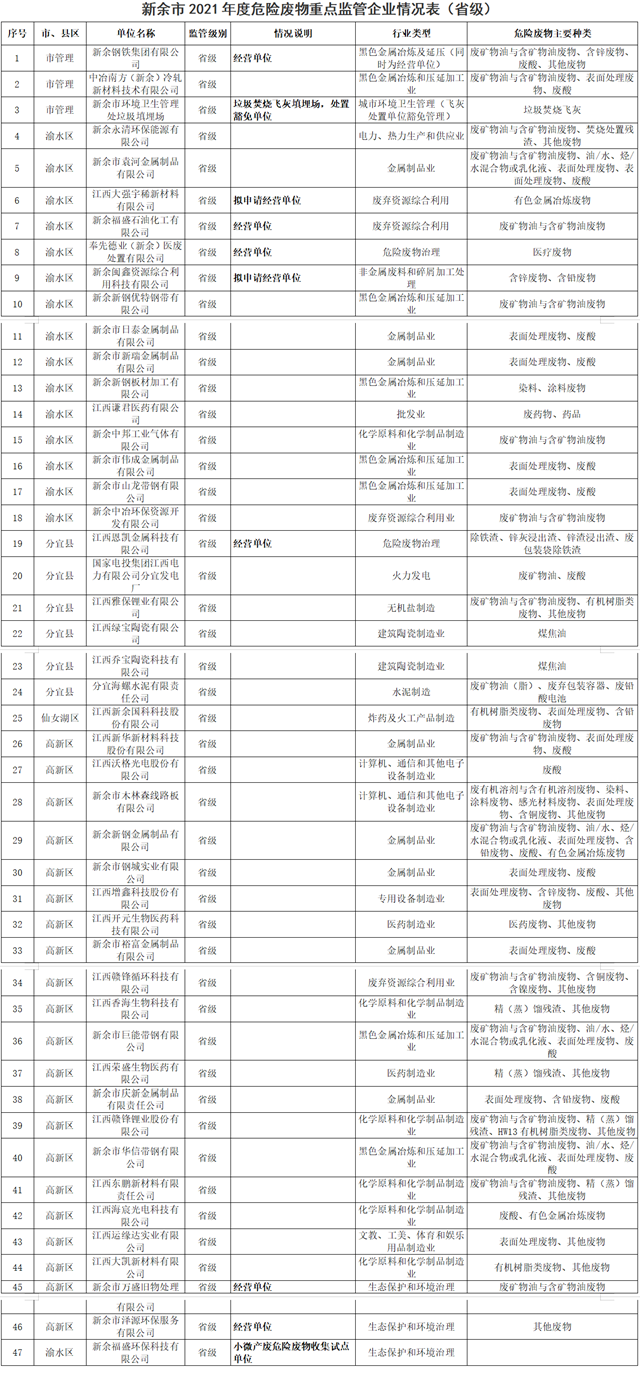 關(guān)于發(fā)布新余市危險(xiǎn)廢物重點(diǎn)監(jiān)管企業(yè)(2021年更新)的公告 根據(jù)江西省生態(tài)環(huán)境廳發(fā)布的《江西省危險(xiǎn)廢物重點(diǎn)監(jiān)管企業(yè)(2021年更新)》(贛環(huán)固體[2021]75號(hào)),以及我市相關(guān)企業(yè)2020年危險(xiǎn)廢物申報(bào)登記情況、經(jīng)營許可證辦理情況,經(jīng)征求各縣區(qū)生態(tài)環(huán)境部門意見,現(xiàn)將新余市省級(jí)、市級(jí)危險(xiǎn)廢物重點(diǎn)監(jiān)管...