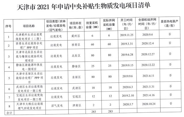 關(guān)于我市2021年申請中央補(bǔ)貼生物質(zhì)發(fā)電項(xiàng)目清單的公示 為促進(jìn)生物質(zhì)發(fā)電高質(zhì)量發(fā)展,按照國家發(fā)展改革委、財(cái)政部、國家能源局印發(fā)的《2021年生物質(zhì)發(fā)電項(xiàng)目建設(shè)工作方案》(發(fā)改能源〔2021〕1190號(hào))要求,積極組織我市生物質(zhì)發(fā)電項(xiàng)目申報(bào)補(bǔ)貼。 經(jīng)過項(xiàng)目單位申報(bào)、申報(bào)信息核查等程序,現(xiàn)將《天津市20...