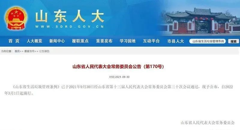 文章導(dǎo)讀《山東省生活垃圾管理條例》于9月30日經(jīng)省十三屆人大常委會第三十次會議審議通過,將于2022年3月1日起施行。山東省人民代表大會常務(wù)委員會公告(第170號)《山東省生活垃圾管理條例》已于2021年9月30日經(jīng)山東省第十三屆人民代表大會常務(wù)委員會第三十次會議通過,現(xiàn)予公布,自2022年3月1日...