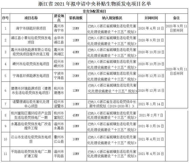 關(guān)于浙江省2021年擬申請(qǐng)中央補(bǔ)貼生物質(zhì)發(fā)電項(xiàng)目名單的公示 為進(jìn)一步完善生物質(zhì)發(fā)電建設(shè)運(yùn)行管理,促進(jìn)生物質(zhì)發(fā)電行業(yè)持續(xù)健康發(fā)展,按照國(guó)家發(fā)展改革委、財(cái)政部、國(guó)家能源局《關(guān)于印發(fā)<2021 年生物質(zhì)發(fā)電項(xiàng)目建設(shè)工作方案>的通知》(發(fā)改能源〔2021〕1190號(hào))的要求,在各市發(fā)展改革委(能...