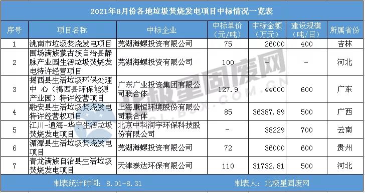8月垃圾焚燒發(fā)電項(xiàng)目中標(biāo)匯總?cè)缦拢?月中標(biāo)企業(yè)中,蕪湖海螺中標(biāo)消息出現(xiàn)頻率頗高,分別在吉林、河北、貴州三地拿標(biāo),據(jù)北極星固廢網(wǎng)統(tǒng)計(jì),蕪湖海螺截止8月底,累計(jì)拿單7個(gè),分別是廣西平果400噸/日垃圾發(fā)電項(xiàng)目、內(nèi)蒙古奈曼旗300噸/日項(xiàng)目、吉林舒蘭400噸/日項(xiàng)目以及洮南400噸/日項(xiàng)目、青海海東市75...