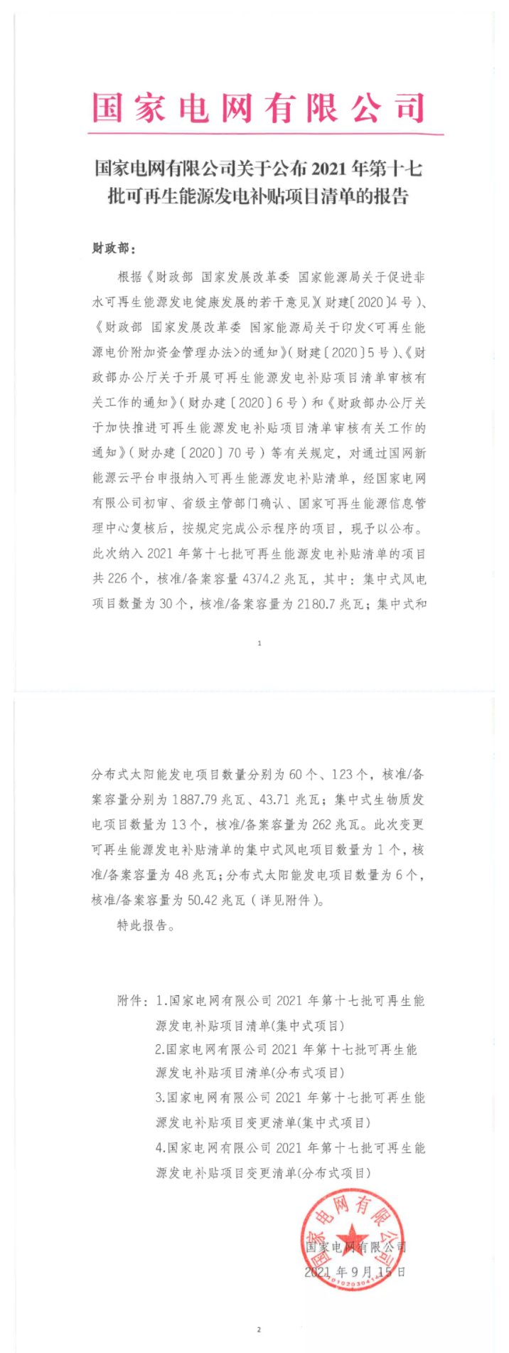 關(guān)于公布2021年第十七批可再生能源發(fā)電補貼項目清單的公告 根據(jù)《財政部 國家發(fā)展改革委 國家能源局關(guān)于促進非水可再生能源發(fā)電健康發(fā)展的若干意見》(財建〔2020〕4號)、《財政部 國家發(fā)展改革委 國家能源局關(guān)于印發(fā)<可再生能源電價附加資金管理辦法>的通知》(財建〔2020〕5號)、《財...