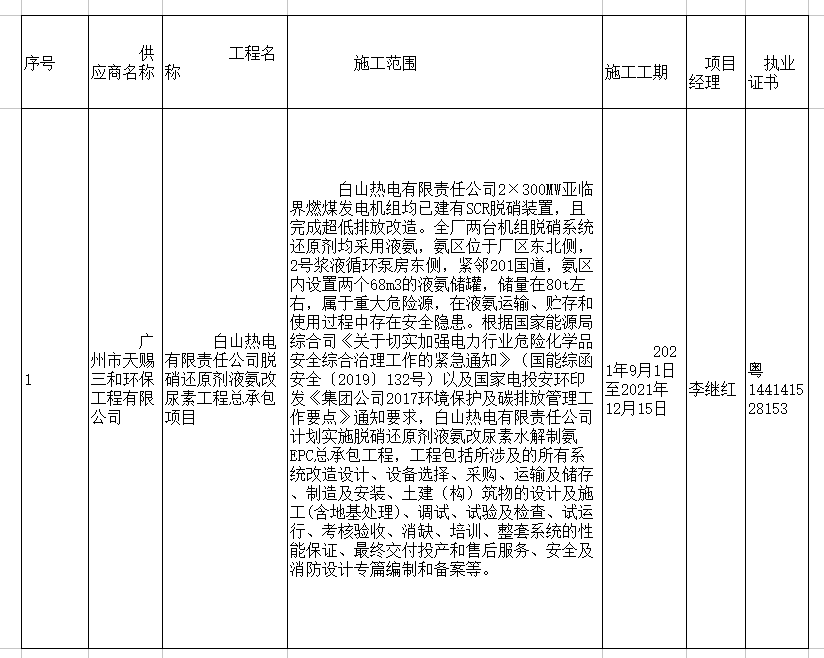 白山熱電有限責(zé)任公司脫硝還原劑液氨改尿素工程總承包項(xiàng)目中標(biāo)公告 一、項(xiàng)目編號(hào):JZT2021GZ072(C01)(招標(biāo)文件編號(hào):JZT2021GZ072(C01)) 二、項(xiàng)目名稱:白山熱電有限責(zé)任公司脫硝還原劑液氨改尿素工程總承包項(xiàng)目 三、中標(biāo)(成交)信息 供應(yīng)商名稱:廣州市天賜三和環(huán)保工程有限公司...