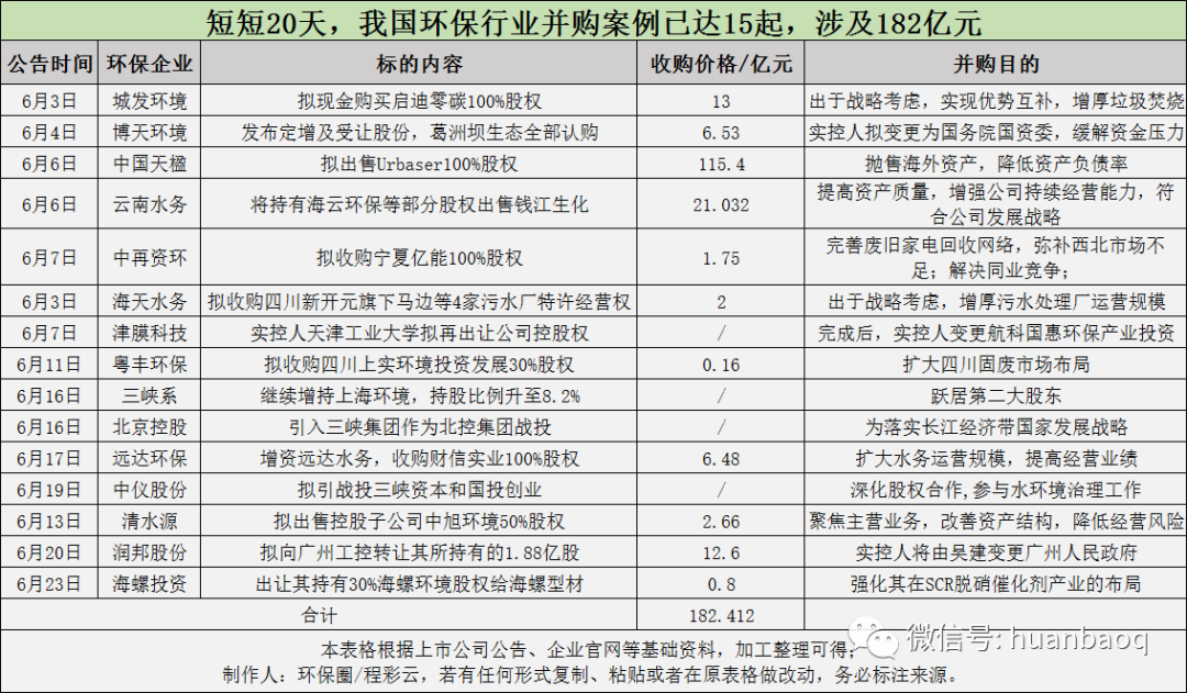 0120天15起收并購(gòu)交易資金近200億元首先,從數(shù)量和金額上,今年上半年我國(guó)環(huán)保產(chǎn)業(yè)收并購(gòu)活動(dòng)比往年愈發(fā)猛烈,其數(shù)量之多和金額之大也刷新了歷史紀(jì)錄,創(chuàng)下了近年來之最(詳細(xì)數(shù)據(jù)見文末)。僅在剛剛過去的20天里(6月3日-6月23日),據(jù)筆者不完全統(tǒng)計(jì),我國(guó)環(huán)保行業(yè)收并購(gòu)案例就高達(dá)15起,粗略估算交易...