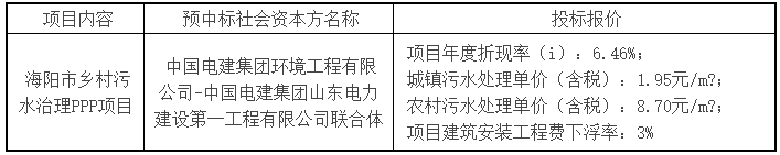 2021年6月25日,山東省政府采購網(wǎng)發(fā)布了海陽市鄉(xiāng)村污水治理PPP項(xiàng)目預(yù)中標(biāo)結(jié)果公示,預(yù)中標(biāo)供應(yīng)商為中國電建集團(tuán)環(huán)境工程有限公司-中國電建集團(tuán)山東電力建設(shè)第一工程有限公司聯(lián)合體。 海陽市鄉(xiāng)村污水治理PPP項(xiàng)目預(yù)中標(biāo)結(jié)果公示 一、采購項(xiàng)目名稱:海陽市鄉(xiāng)村污水治理PPP項(xiàng)目 二、采購項(xiàng)目編號(hào):SDGP...