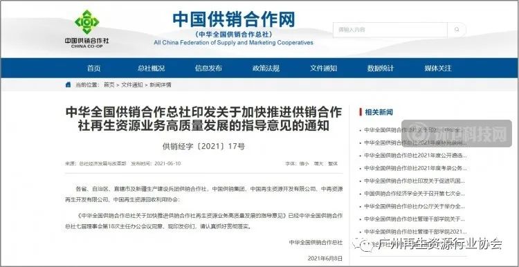 文章導(dǎo)讀6月10日,中國供銷合作社官網(wǎng)印發(fā)關(guān)于加快推進(jìn)供銷合作社再生資源業(yè)務(wù)高質(zhì)量發(fā)展的指導(dǎo)意見的通知。明確到“十四五”末,全系統(tǒng)發(fā)展城鄉(xiāng)回收網(wǎng)點(diǎn)8萬個(gè),建設(shè)綠色分揀中心2000個(gè),綜合利用園區(qū)(基地)300個(gè)。形成“村級(jí)收集+鄉(xiāng)鎮(zhèn)轉(zhuǎn)運(yùn)+縣域處理+再生資源基地綜合利用”覆蓋城鄉(xiāng)的供銷合作社再生資源回...