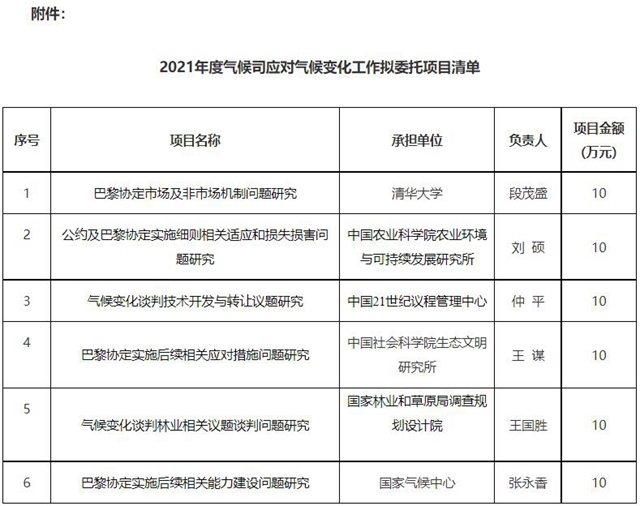 關(guān)于2021年度應(yīng)對(duì)氣候變化工作擬委托項(xiàng)目的公示各有關(guān)單位: 根據(jù)《生態(tài)環(huán)境部財(cái)政撥款項(xiàng)目委托業(yè)務(wù)費(fèi)管理辦法》(科財(cái)函〔2019〕226號(hào))要求,經(jīng)申報(bào)匯總、形式審核、專(zhuān)家評(píng)審并報(bào)應(yīng)對(duì)氣候變化司領(lǐng)導(dǎo)審定,擬立項(xiàng)開(kāi)展2021年度應(yīng)對(duì)氣候變化工作委托項(xiàng)目共6項(xiàng),現(xiàn)將項(xiàng)目名單公示如下: 一、公示內(nèi)容 氣候...