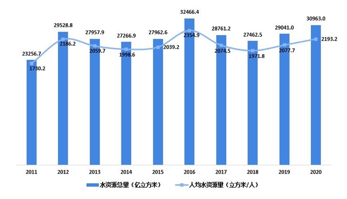 本文核心數(shù)據(jù):中國(guó)水資源總量及人均水資源量、全國(guó)流域總體水質(zhì)狀況、重點(diǎn)監(jiān)測(cè)胡泊(水庫(kù))水質(zhì)分布、國(guó)家級(jí)地下水和淺層地下水水質(zhì)情況 政策助力水治理行業(yè)發(fā)展 2011-2020年,我國(guó)水資源總量整體呈現(xiàn)波動(dòng)變化的趨勢(shì),與此同時(shí),人均水資源量也處于不穩(wěn)定狀態(tài),2020年為2193.2立方米/人。按照國(guó)際公...