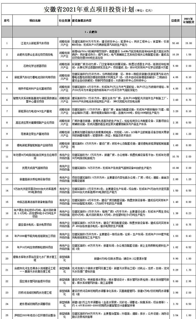 2021年2月26日, 安徽省人民政府發(fā)布《2021年重點(diǎn)項(xiàng)目投資計(jì)劃》,合計(jì)7851個(gè)。 生態(tài)環(huán)保類別有286個(gè): 1、十五里河流域治理一期工程項(xiàng)目 2、資源循環(huán)利用及生態(tài)處置項(xiàng)目 3、肥東十八聯(lián)圩生態(tài)濕地項(xiàng)目 4、新站區(qū)少荃湖綜合治理工程項(xiàng)目 5、鐘油坊社區(qū)人居綜合環(huán)境整治項(xiàng)目 6、南淝河下游環(huán)...