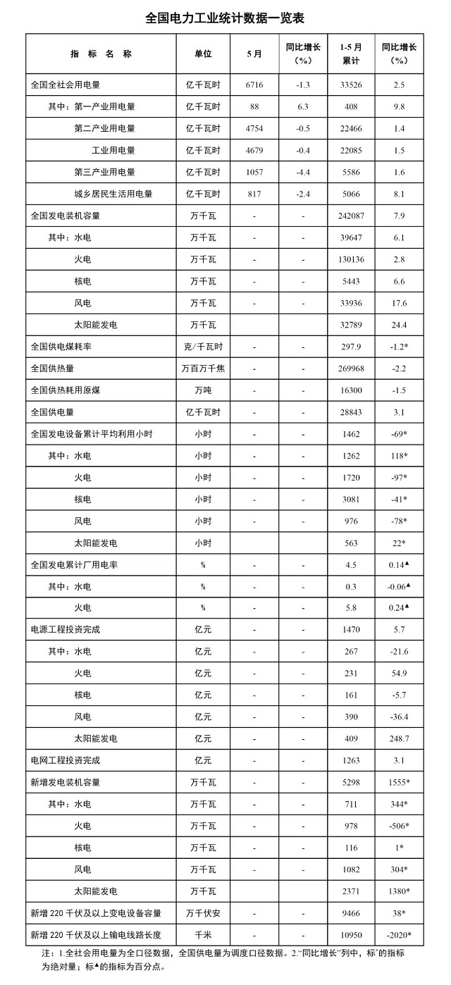 6月16日,國家能源局發(fā)布1-5月份全國電力工業(yè)統(tǒng)計(jì)數(shù)據(jù)。截至5月底,全國發(fā)電裝機(jī)容量約24.2億千瓦,同比增長(zhǎng)7.9%。其中,風(fēng)電裝機(jī)容量約3.4億千瓦,同比增長(zhǎng)17.6%;太陽能發(fā)電裝機(jī)容量約3.3億千瓦,同比增長(zhǎng)24.4%。 1-5月份,全國發(fā)電設(shè)備累計(jì)平均利用1462小時(shí),比上年同期減少69...