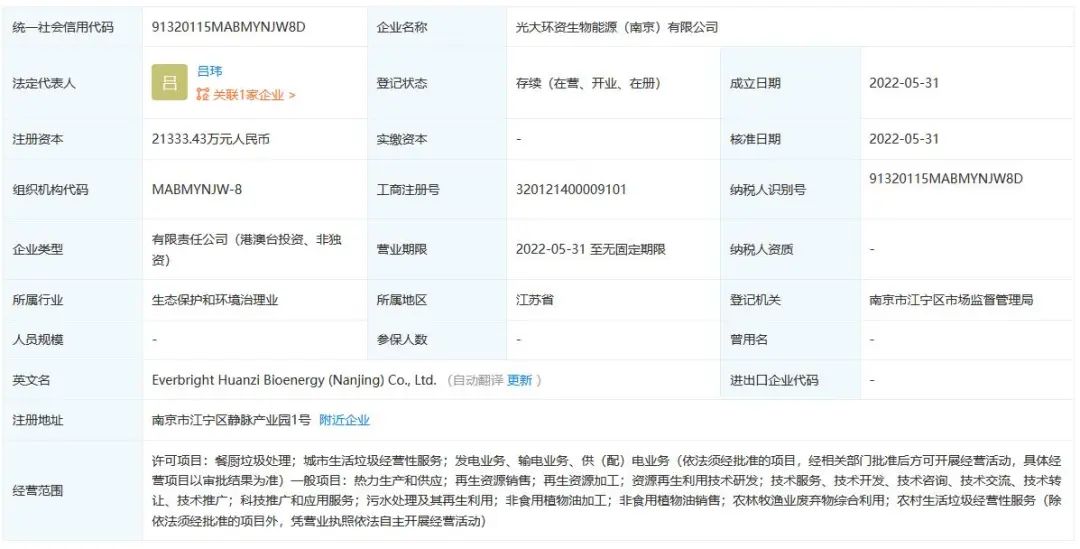 據(jù)企查查顯示,2022年5月31日光大環(huán)資生物能源(南京)有限公司成立,注冊資本2.13億人民幣,法定代表人為呂瑋。經(jīng)營范圍包含許可項(xiàng)目:餐廚垃圾處理;城市生活垃圾經(jīng)營性服務(wù);發(fā)電業(yè)務(wù)、輸電業(yè)務(wù)、供(配)電業(yè)務(wù)(依法須經(jīng)批準(zhǔn)的項(xiàng)目,經(jīng)相關(guān)部門批準(zhǔn)后方可開展經(jīng)營活動(dòng),具體經(jīng)營項(xiàng)目以審批結(jié)果為準(zhǔn))一般項(xiàng)...