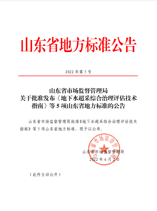 山東省市場監(jiān)督管理局關(guān)于批準發(fā)布《地下水超采綜合治理評估技術(shù)指南》等5項山東省地方標準的公告 山東省市場監(jiān)督管理局批準《地下水超采綜合治理評估技術(shù)指南》等5項山東省地方標準,現(xiàn)予以公布。 山東省市場監(jiān)督管理局 2022年6月2日 相關(guān)資料下載: 標準文本 編制說明.zip