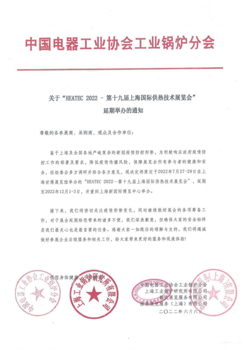 關(guān)于“HEATEC2022—第十九屆上海國際供熱技術(shù)展覽會”延期舉辦的通知尊敬的各參展商、采購商、觀眾及合作單位: 鑒于上海及全國各地嚴峻復雜的疫情防控形勢,為積極響應(yīng)政府疫情防控工作的部署及要求,降低疫情傳播風險,保障展覽會所有參與者的健康和安全,經(jīng)組委會多方調(diào)...