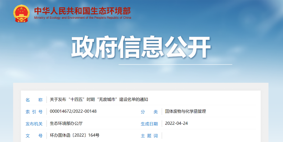 關(guān)于發(fā)布“十四五”時期“無廢城市”建設(shè)名單的通知各省、自治區(qū)、直轄市生態(tài)環(huán)境廳(局): 為落實(shí)《中共中央 國務(wù)院關(guān)于深入打好污染防治攻堅戰(zhàn)的意見》和《“十四五”時期“無廢城市”建設(shè)工作方案》(以下簡稱《工作方案》),我部會同有關(guān)部門,根據(jù)各省份推薦情況,綜合考慮城市基礎(chǔ)條件、工作積極性和國家相關(guān)重大...