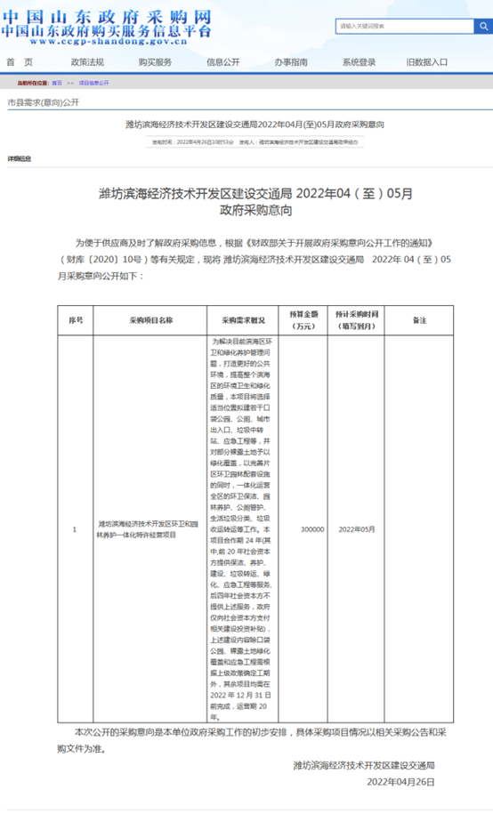 采購項(xiàng)目名稱:濰坊濱海經(jīng)濟(jì)技術(shù)開發(fā)區(qū)環(huán)衛(wèi)和園林養(yǎng)護(hù)一體化特許經(jīng)營項(xiàng)目預(yù)算金額:300000(萬元)預(yù)計采購時間:2022年05月采購需求概況:為解決目前濱海區(qū)環(huán)衛(wèi)和綠化養(yǎng)護(hù)管理問題,打造更好的公共環(huán)境,提高整個濱海區(qū)的環(huán)境衛(wèi)生和綠化質(zhì)量,本項(xiàng)目將選擇適當(dāng)位置擬建若干口袋公園、公廁、城市出入口、垃圾中...