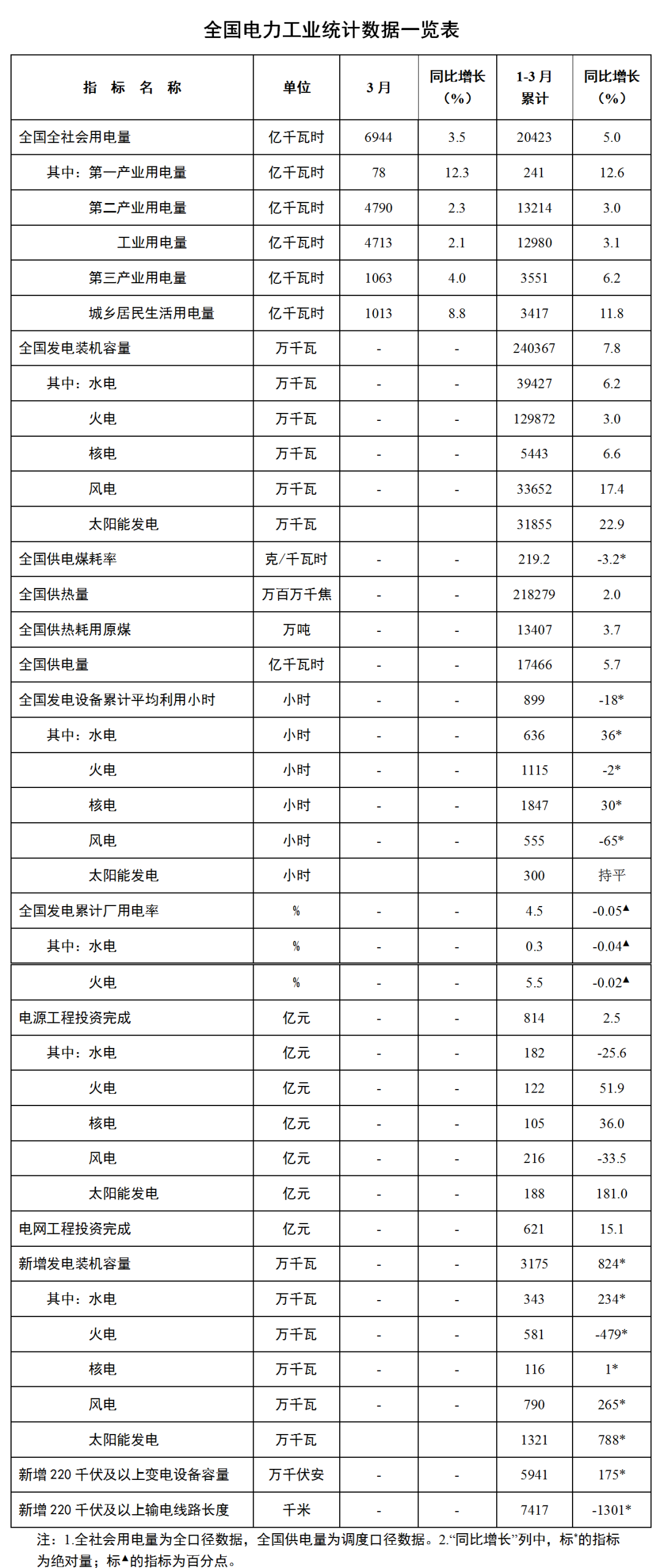 4月20日,國家能源局發(fā)布1-3月份全國電力工業(yè)統(tǒng)計(jì)數(shù)據(jù)。截至3月底,全國發(fā)電裝機(jī)容量約24.0億千瓦,同比增長7.8%。其中,風(fēng)電裝機(jī)容量約3.4億千瓦,同比增長17.4%;太陽能發(fā)電裝機(jī)容量約3.2億千瓦,同比增長22.9%。 1-3月份,全國發(fā)電設(shè)備累計(jì)平均利用899小時(shí),比上年同期減少18小...