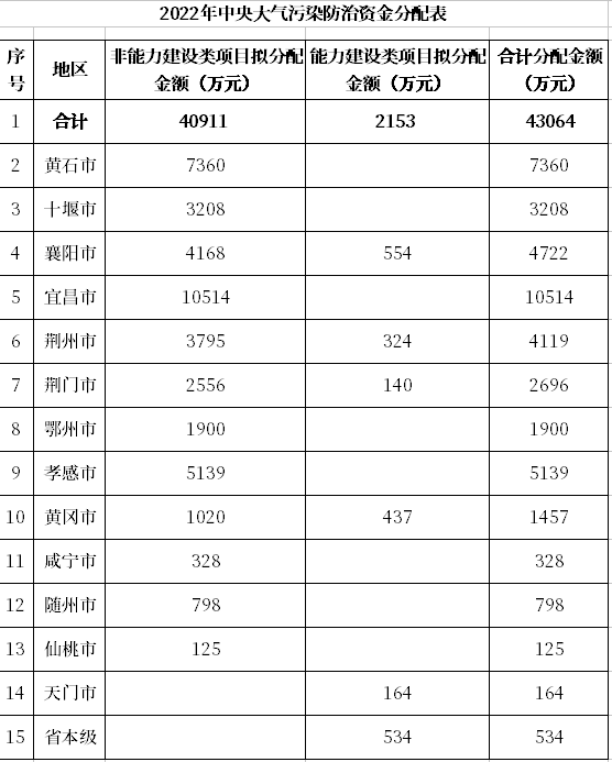 2022年4月14日,湖北省財(cái)政廳發(fā)布“關(guān)于下達(dá)2022年中央大氣污染防治資金的通知”,明確今年中央大氣污染防治資金分配情況,共43064萬(wàn)元,非能力建設(shè)類項(xiàng)目擬分配金額40911萬(wàn)元,能力建設(shè)類項(xiàng)目擬分配金額2153萬(wàn)元。具體分配見下表: 原文如下: 省財(cái)政廳關(guān)于下達(dá)202...