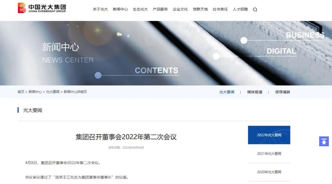 4月8日,集團(tuán)召開(kāi)董事會(huì)2022年第二次會(huì)議決議通過(guò),選舉王江先生為本公司董事長(zhǎng)。 據(jù)中國(guó)光大集團(tuán)股份公司官網(wǎng)消息,4月8日,集團(tuán)召開(kāi)董事會(huì)2022年第二次會(huì)議決議通過(guò),選舉王江先生為本公司董事長(zhǎng)。根據(jù)公告,王江現(xiàn)任本公司黨委書(shū)記、董事長(zhǎng),兼任中國(guó)光大集團(tuán)股份公司黨校名譽(yù)校長(zhǎng),中國(guó)光大銀行股份有限公...