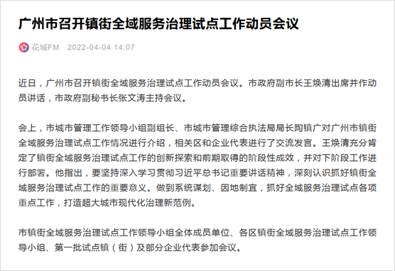 創(chuàng)新思路推動(dòng)城市治理體系和治理能力現(xiàn)代化,廣州為超大城市鎮(zhèn)街全域服務(wù)治理探路。鳳凰網(wǎng)廣東自市城市管理綜合執(zhí)法局獲悉,繼2021年底廣州市印發(fā)《關(guān)于開(kāi)展鎮(zhèn)街全域服務(wù)治理試點(diǎn)工作方案》以來(lái),2022年4月1日,廣州市召開(kāi)鎮(zhèn)街全域服務(wù)治理試點(diǎn)工作動(dòng)員會(huì)議,匯報(bào)有關(guān)工作開(kāi)展情況,全面啟動(dòng)全域服務(wù)治理試點(diǎn)工作...