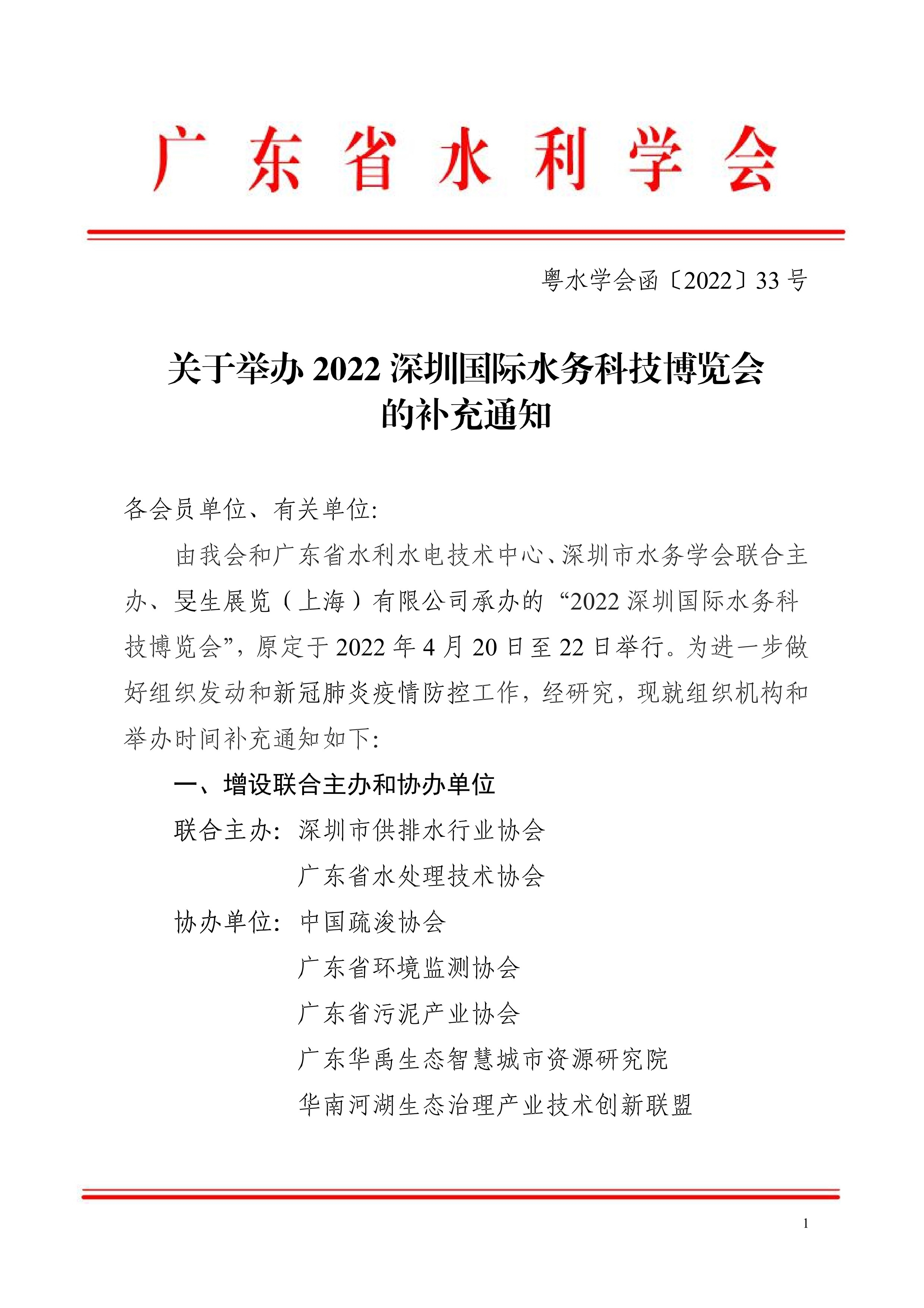 關(guān)于2022深圳國際水務(wù)科技博覽會補充通知各會員單位、有關(guān)單位: 由我會與廣東省水利水電技術(shù)中心、深圳市水務(wù)學(xué)會共同主辦、旻生展覽(上海)有限公司承辦的“2022深圳國際水務(wù)科技博覽會”,原定于2022年4月20日至22日舉行。為進一步做好組織發(fā)動和新冠肺炎疫情防控工作,有關(guān)...