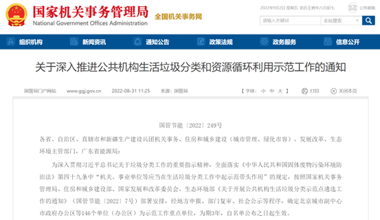 關(guān)于深入推進公共機構(gòu)生活垃圾分類和資源循環(huán)利用示范工作的通知國管節(jié)能〔2022〕249號各省、自治區(qū)、直轄市和新疆生產(chǎn)建設(shè)兵團機關(guān)事務、住房和城鄉(xiāng)建設(shè)(城市管理、綠化市容)、發(fā)展改革、生態(tài)環(huán)境主管部門,廣東省能源局:為深入貫徹習近平總書記關(guān)于垃圾分類工作的重要指示精神,全面落實《中華人民共和國固體廢...