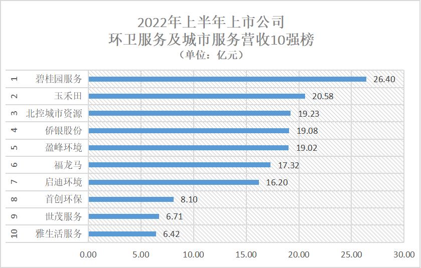 保利物業(yè)、恒大物業(yè)、建業(yè)新生活、金科服務、粵豐環(huán)保、招商積余、中創(chuàng)環(huán)保、旺能環(huán)境、光大環(huán)境、博世科、城發(fā)環(huán)境等11家上市公司未公布上半年“環(huán)衛(wèi)服務”或“城市服務”營收數(shù)據(jù)。其中,碧桂園服務、玉禾田、北控城市資源、僑銀股份、盈峰環(huán)境、福龍馬、啟迪環(huán)境、首創(chuàng)環(huán)保、世茂服務、雅生活服務等10家上市公司進入...
