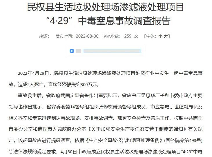 2022年4月29日,民權(quán)縣生活垃圾處理場滲濾液處理項目維修作業(yè)中發(fā)生一起中毒窒息事故,造成2人死亡,直接經(jīng)濟損失約300萬元。民權(quán)縣生活垃圾處理場滲濾液處理項目“4·29”中毒窒息事故調(diào)查報告2022年4月29日,民權(quán)縣生活垃圾處理場滲濾液處理項目維修作業(yè)中發(fā)生一起中毒窒息事故,造成2人死亡,直接...