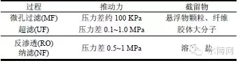 膜按表面孔徑的大小,一般可分為微濾膜、超濾膜、納濾和反滲透膜,其分離目標見表1。常用于MBR 處理工藝中的是微濾膜和超濾膜。