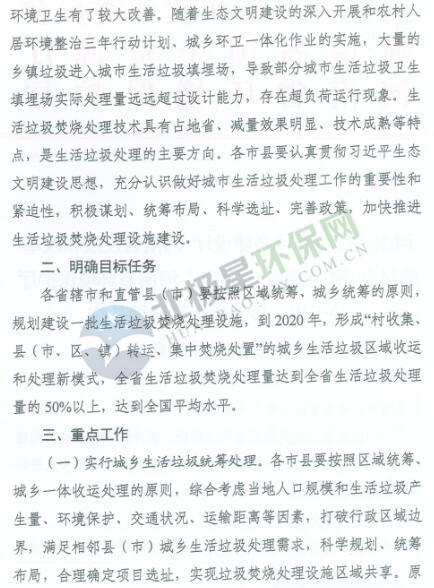 日前,河南省發(fā)布關(guān)于于進一步加快生活垃圾焚燒處理設(shè)施建設(shè)的意見,到2020年,全省生活垃圾焚燒處理要達到全省生活垃圾量的50%以上。詳情如下: