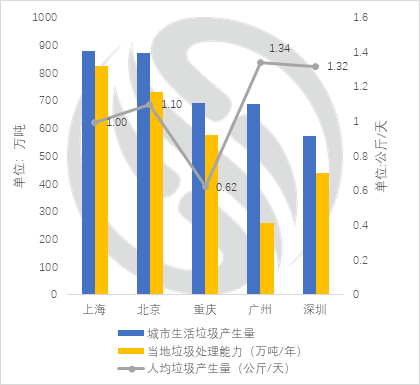 根據(jù)《2017年全國大、中城市固體廢物污染環(huán)境防治年報》,2016年我國城市生活垃圾產(chǎn)生量上海居首,北京次之。考慮到常住人口,人均生活垃圾產(chǎn)生量最大的城市為廣州,深圳次之??梢钥闯瞿戏匠鞘猩罾娜司a(chǎn)量相對較高,E20研究院認為這可能與不同地域人口飲食習慣不同存在關系。結合當年各城市實際處理能力來看,廣州缺口明顯,且人均垃圾產(chǎn)生量大,垃圾圍城形勢最為嚴峻。本文僅選取人均日均生活垃圾產(chǎn)生量在1公斤左右的四座一線城市:廣州、深圳、北京、上海進行分析。