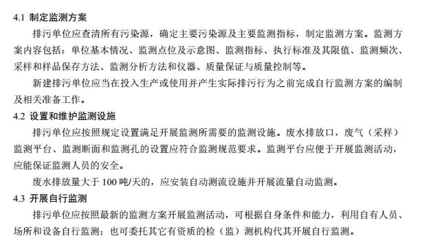 一是自行監(jiān)測的一般要求,即制定監(jiān)測方案、設(shè)置和維護監(jiān)測設(shè)施、開展自行監(jiān)測、做好監(jiān)測質(zhì)量保證與質(zhì)量控制、記錄保存和公開監(jiān)測數(shù)據(jù)的基本要求;