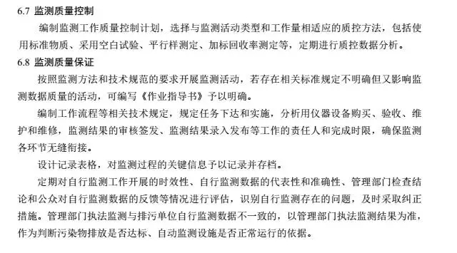 覆蓋全過程。按照排污單位開展監(jiān)測活動的整個過程,從制定方案、設(shè)置和維護監(jiān)測設(shè)施、開展監(jiān)測、做好監(jiān)測質(zhì)量保證與質(zhì)量控制、記錄和保存監(jiān)測數(shù)據(jù)的全過程各環(huán)節(jié)進行考慮。
