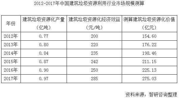隨著城鎮(zhèn)化腳步的加速,每年我國有越來越多的建筑新建和重建,這些新建和重建的過程便會產(chǎn)生大量的建筑垃圾。由于建筑垃圾數(shù)據(jù)產(chǎn)量的統(tǒng)計存在較大難度,很少有國家建立起對建筑垃圾的統(tǒng)計體系,只能采取可獲得的數(shù)據(jù)進行合理估計。智研咨詢發(fā)布的《2019-2025年中國建筑垃圾處理行業(yè)市場發(fā)展模式調(diào)研及投資趨勢分析研究報告》中顯示:2017年國內(nèi)建筑垃圾保守估計約19.3億噸,同比2016年的18.01億噸增長了7.16%。