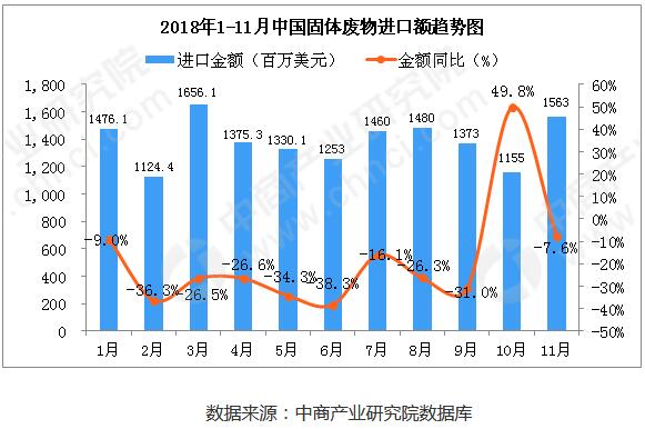 從金額方面來看,2018年8-10月中國固體廢物進口金額呈下降趨勢,2018年11月中國固體廢物進口金額有大幅度回升;2018年11月中國固體廢物進口金額為1563百萬美元,同比下降7.6%。
