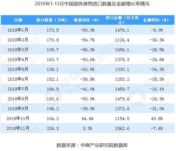 據(jù)中商產(chǎn)業(yè)研究院數(shù)據(jù)庫顯示,2018年11月中國固體廢物進口量大幅度增長,2018年11月中國固體廢物進口量為226.3萬噸,同比增長3.3%。
