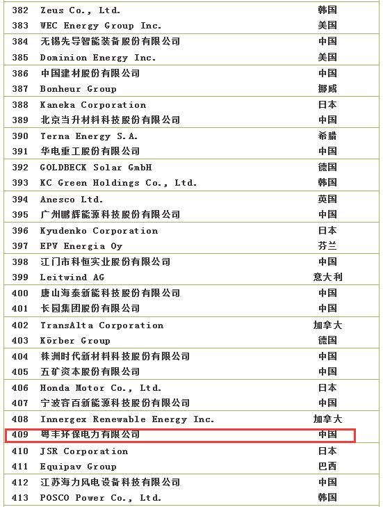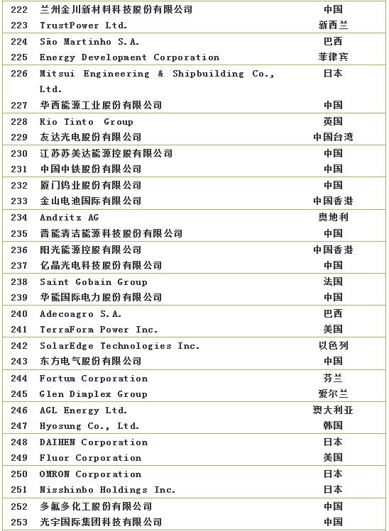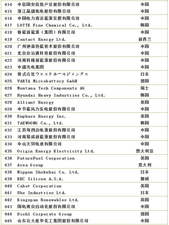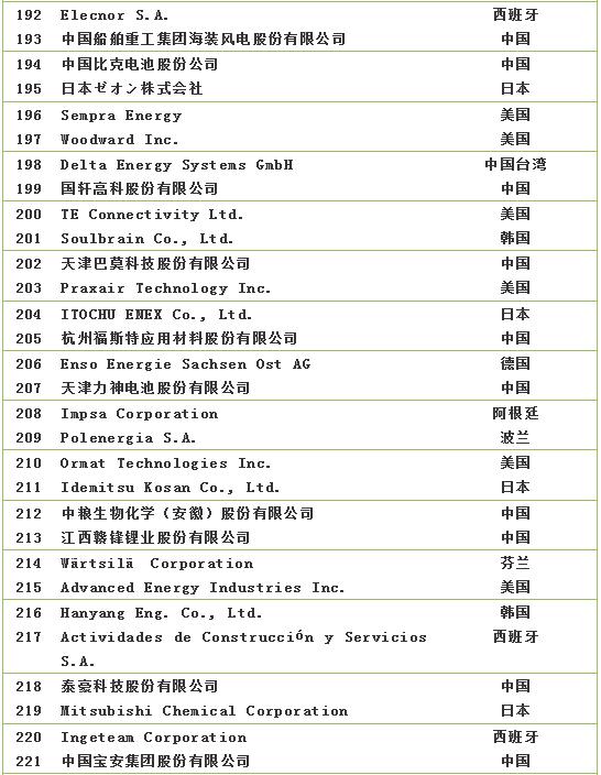 中國(中國大陸及香港、澳門、臺灣)有協(xié)鑫(集團)控股有限公司、晶龍實業(yè)集團有限公司、晶科能源控股有限公司、天合光能有限公司、新疆金風科技股份有限公司、龍源電力集團股份有限公司等217家企業(yè)進入“500強”榜單,比去年(198家)增加19家,占43.4%,居首位;