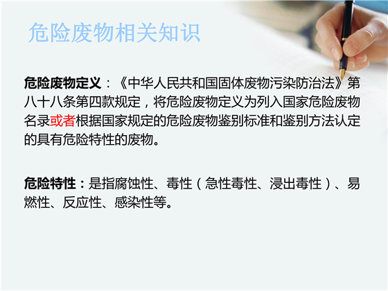 2018年石家莊市固體廢物管理培訓(xùn)會(huì)議課件日前公布,其中,“危險(xiǎn)廢物法律法規(guī)和標(biāo)準(zhǔn)規(guī)范”共108張PPT,從固體廢物相關(guān)知識(shí)、我國危險(xiǎn)廢物的主要法律制度、危險(xiǎn)廢物規(guī)范化管理指標(biāo)體系、2018年度危險(xiǎn)廢物規(guī)范化管理督查考核四方面進(jìn)行了詳細(xì)闡述。詳情如下: