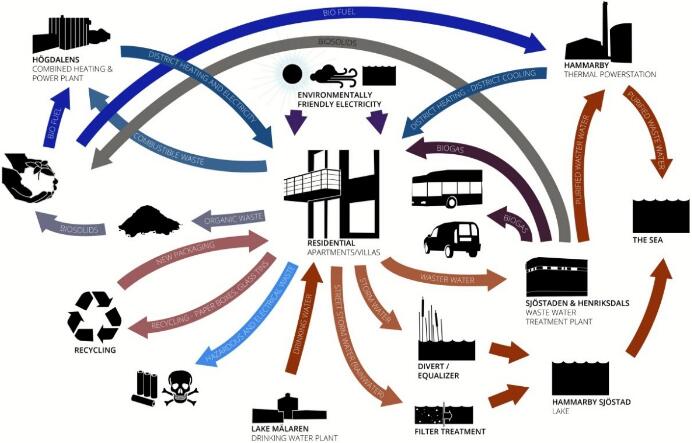 其中,1996年由斯德哥爾摩水公司、Fortum (能源公司) 和城市廢物回收公司合作開發(fā)的哈馬碧生態(tài)模型至關重要。該模型的主要原理是最大程度地實現(xiàn)材料和能源流的局部閉環(huán)。它展示了如何將廢物回收、水、地區(qū)供暖供冷和交通,與城市規(guī)劃、景觀及建筑設計進行整合, 最大限度地減少材料和能源的消耗。