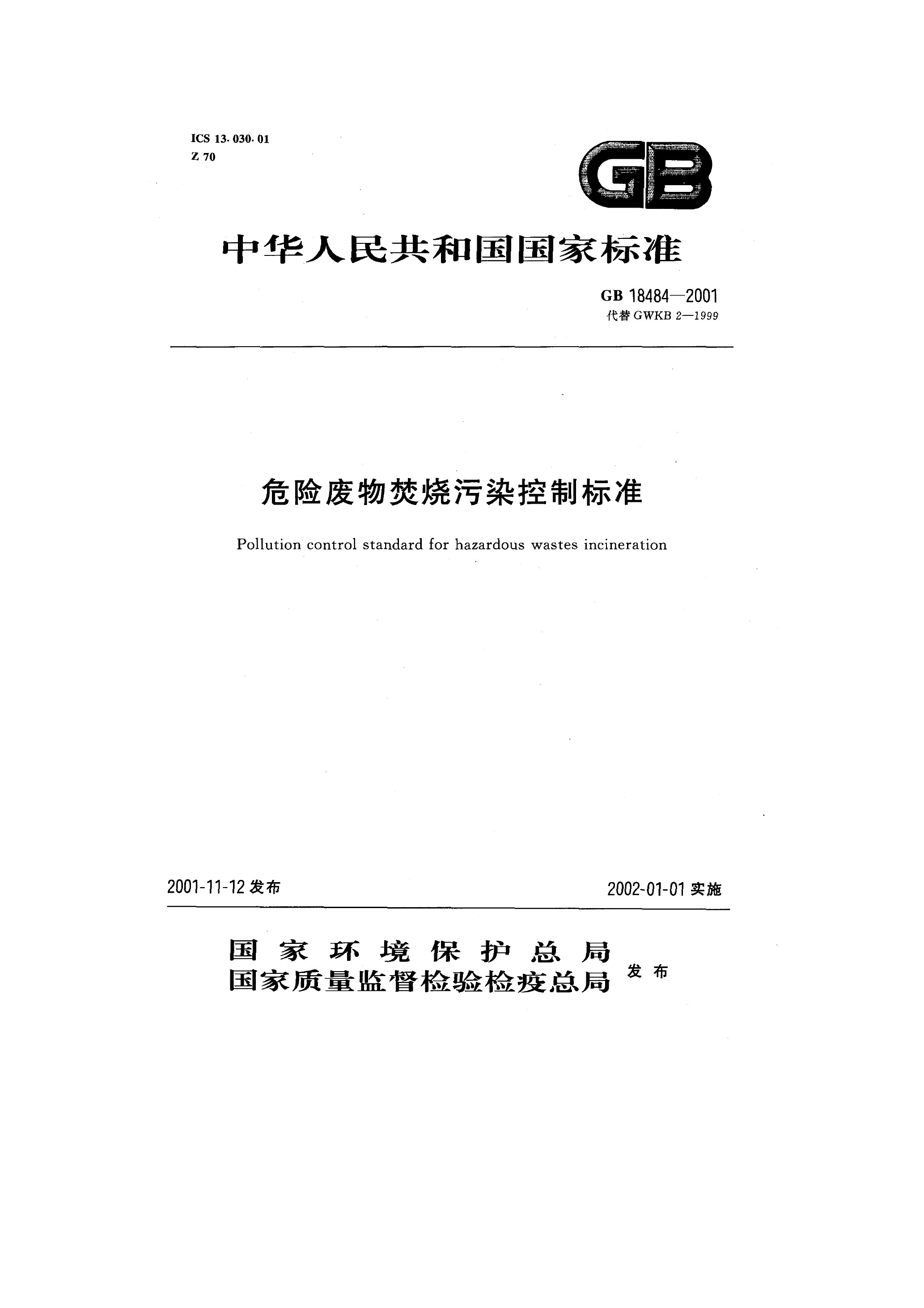 危險廢物焚燒污染控制標(biāo)準(zhǔn)(GB18484-2001)